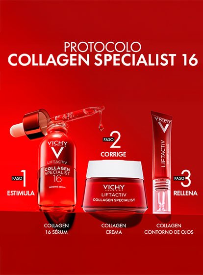 ¿La ciencia detrás de una piel joven? No es sólo uno, sino 16 colágenos. Ahora, dentro de la nueva gama Vichy Collagen Specialist 16, la exclusiva Tecnología Co-Bonding (Rhamnosa + Péptidos + Maitake) que potencia y une todas las familias de colágeno* para una matriz de colágeno más fuerte. Corrige 16 signos del envejecimiento**.